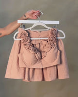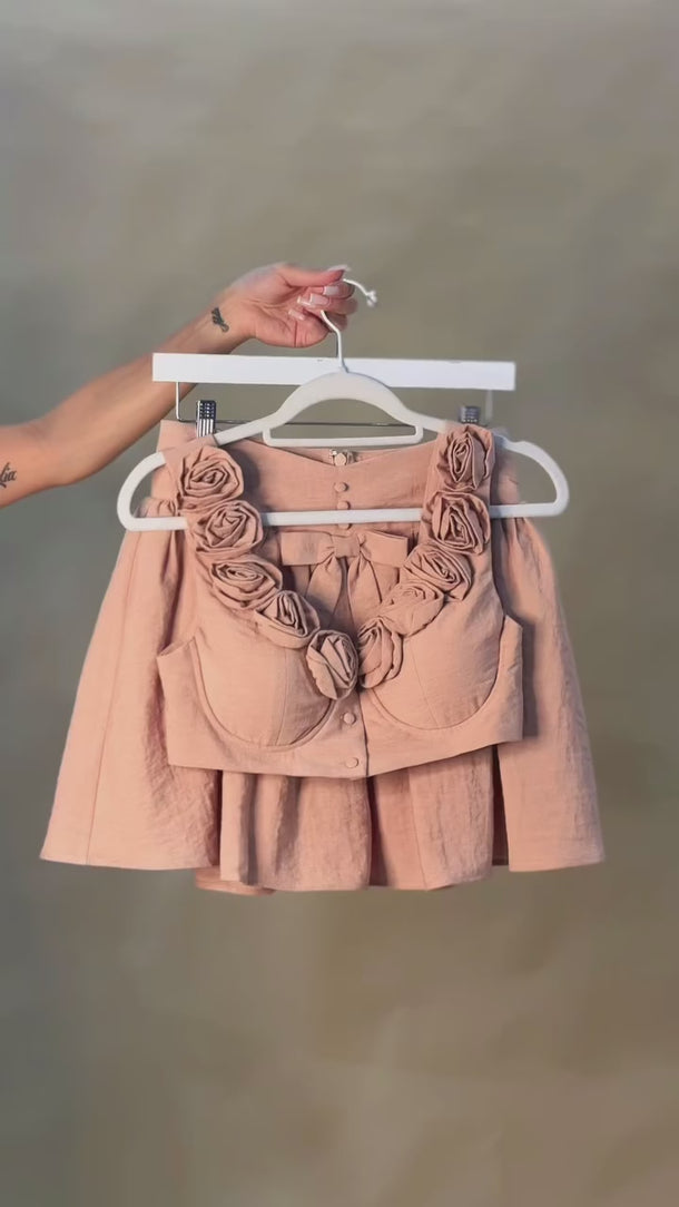 Feminine, flirty, and full of charm — the Rosette Romance Skirt Set brings delicate details to life. Crafted from textured woven fabric, this two-piece set features a button-up crop top with a structured padded bra and underwire for a flattering, secure fit. The rose-trimmed neckline adds a romantic touch, while the smocked back ensures flexibility and comfort. The high-waist pleated skirt is finished with decorative buttons, a sweet bow detail, and a back zipper closure. Double-lined for volume and graceful movement, this dreamy set is perfect for garden parties, brunches, or any moment worth celebrating.