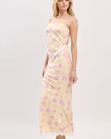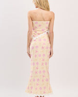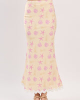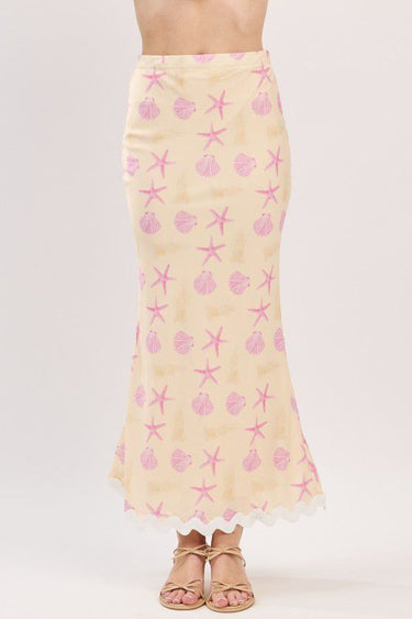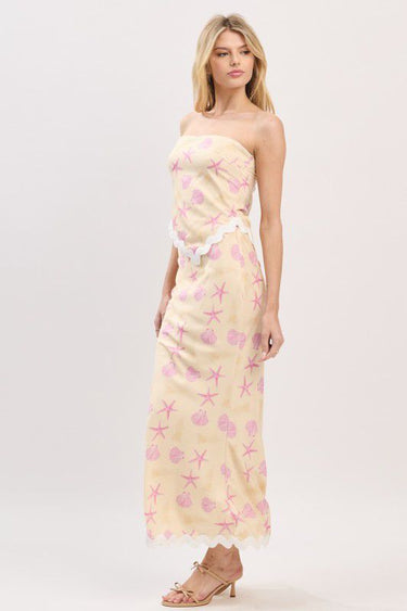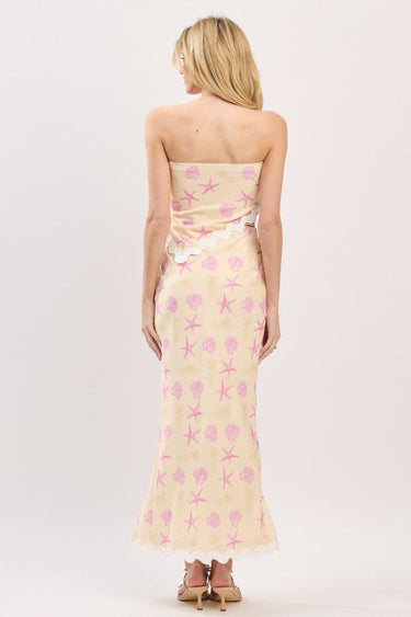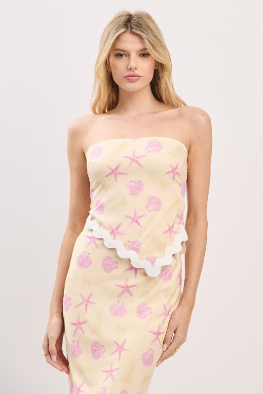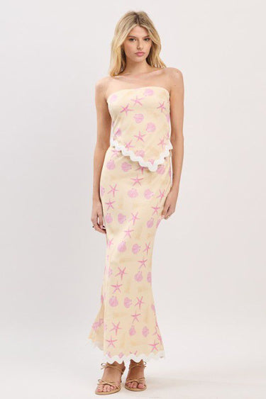 This charming skirt set brings vacation vibes to life with playful seashell and starfish prints throughout. The strapless tube top features a wavy trim hem for a feminine touch, while the matching mermaid skirt enhances your curves with a graceful flare. Light, breezy, and perfect for coastal getaways or sunny-day events.