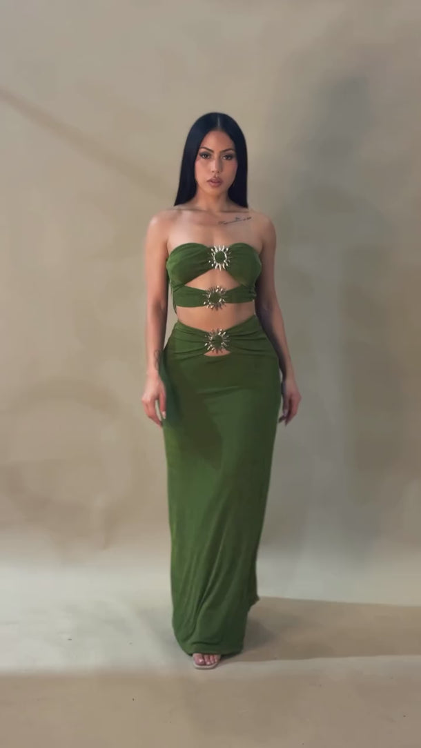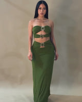 Turn heads in this radiant two-piece set featuring a bandeau-style top and a curve-hugging maxi skirt, connected by bold sunburst hardware accents. Designed to flatter with strategic cut-outs and a sleek fit, this set offers the perfect blend of sultry and statement.