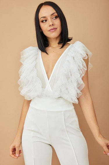 PRODUCT DETAIL - SLEEVELESS, LAYERED MESH RUFFLE DETAIL CONTENTS & CARE - SELF: 100% Polyester / CONT: 95% Polyester 5% Spandex - Hand Wash Cold, Do not Bleach, air dry flat IMPORTED Model is 5'8" tall and wearing Small size