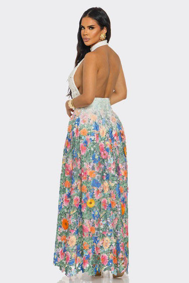 Step into elegance with the Blooming Grace Lace Maxi Dress. Featuring a halter neckline and choker-style lace bodice, this dress stuns with its open back and back zipper closure. The floral-embroidered mesh skirt is adorned with lifelike 3D flowers for a breathtaking finish. Designed with a full lining for comfort and crafted from a stretch fabric blend, it’s the perfect statement for garden parties, bridal events, or summer soirées.