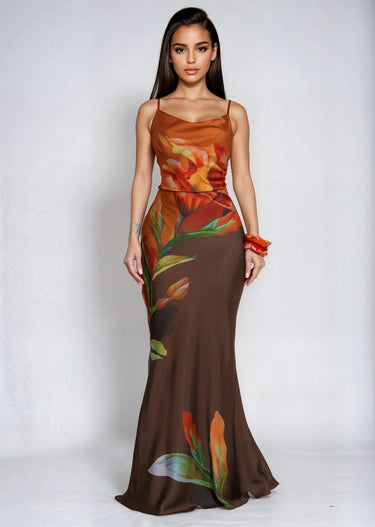Make a statement in the Botanical Flame Satin Maxi Dress — a sleek silhouette with oversized floral print, cowl neckline, and dramatic open back. Designed with adjustable crisscross ties and a flattering drape, it’s your go-to for elevated evenings or resort escapes.