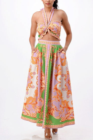 TOP * Smocked ruffle bandeau. * Halter and Front bow tie style SKIRT * Elastic waistband * Front button down midi length full skirt * It has a pocket100% Polyester