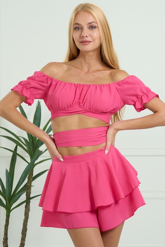 - Off Shoulder in Cap Sleeve & Waist Shorts Set
