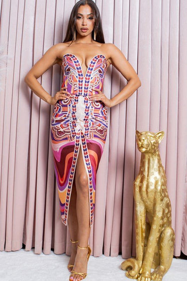 TOP * Deep V bustier top * It has V-shaped wire and bone * Extreme stretched fabric * Back open with zipper SKIRT * Front pleated draped skirt * Elastic waist band * Stretched soft jersey fabric * Front sexy deep slit