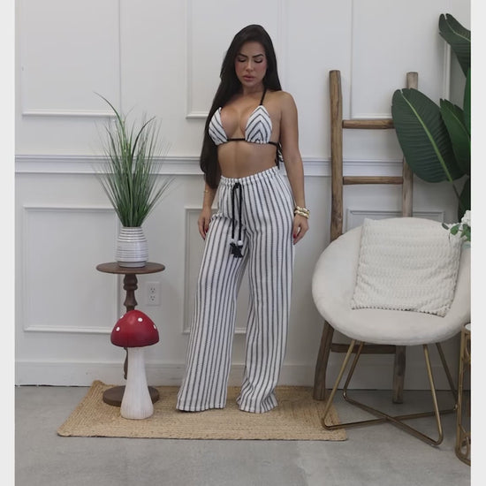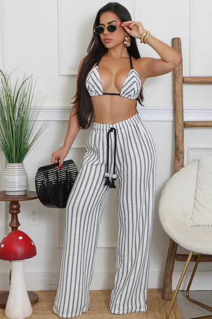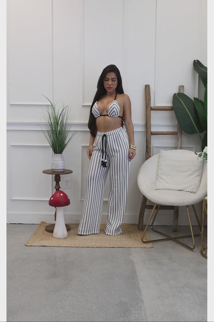 Crochet knit halter bikini & wide leg pants set - Black & White