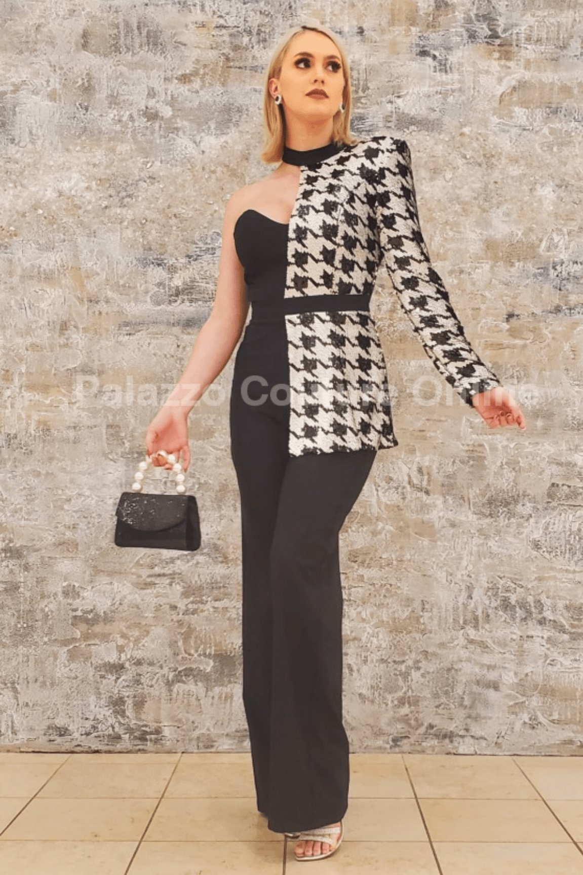 Dale Black White Houndtooth Sequins single Shoulder Jumpsuit