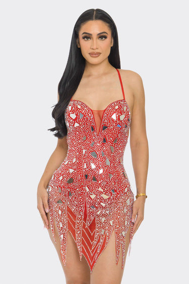 Dazzling Rhinestone Glam Mini Dress (Red)