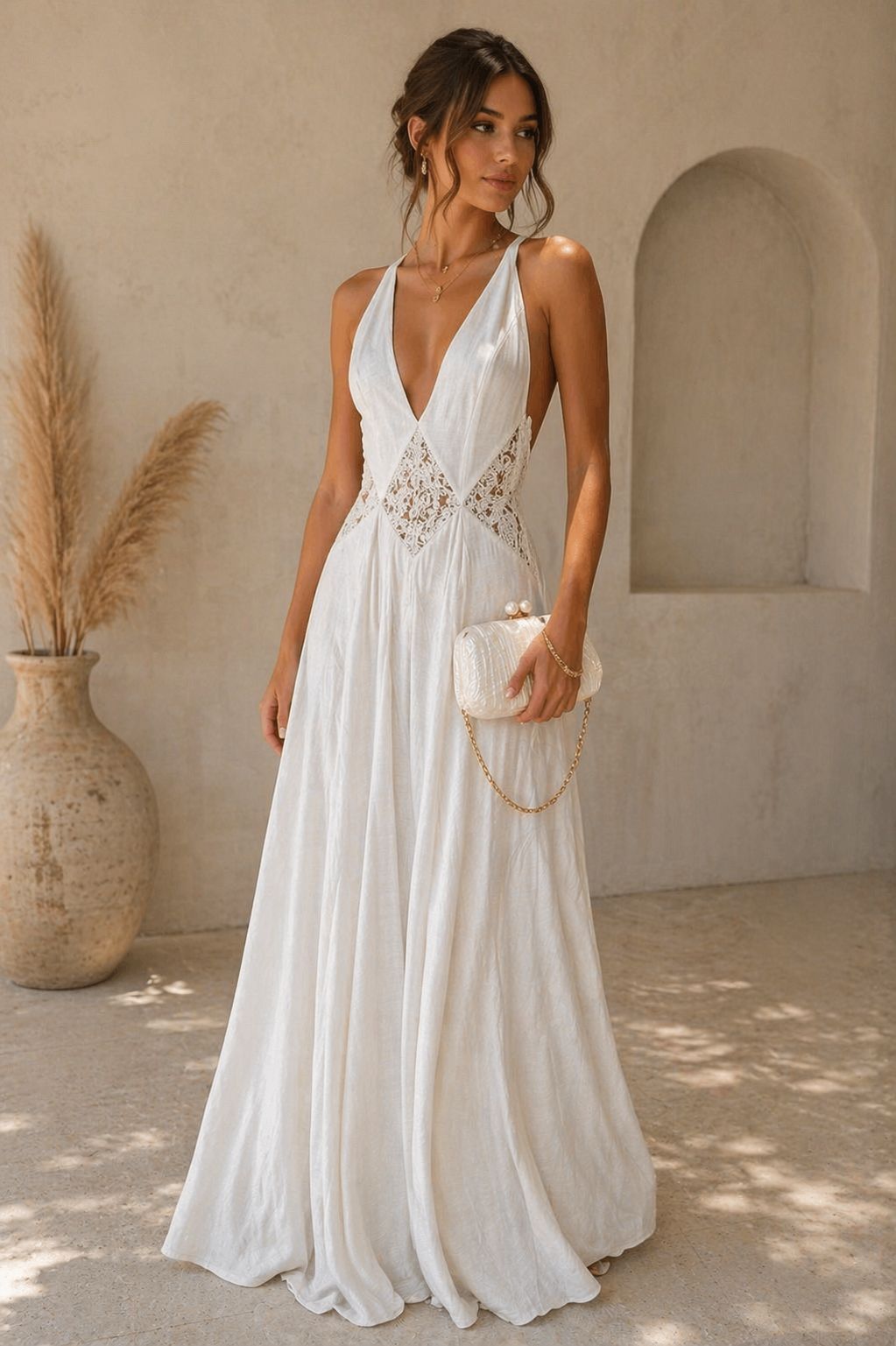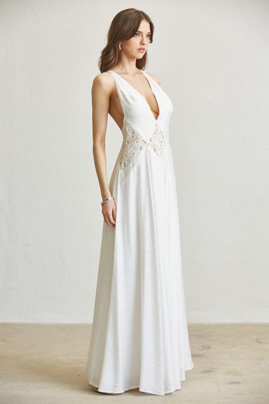 Elevate your wardrobe with this effortlessly feminine maxi dress designed to captivate from every angle. Featuring a plunging neckline and delicate lace paneling at the waist, this silhouette enhances your natural shape while maintaining an airy, elegant flow. The low-back design adds a subtle yet striking allure, making it the perfect statement piece for daytime events, vacations, or romantic evenings.