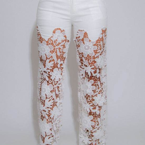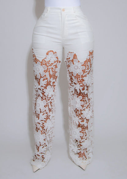 Make a statement in these ultra-feminine and undeniably chic Fierce Bloom Lace Pants. Crafted with a high-waisted denim top and flowing sheer lace legs, these pants effortlessly blend casual structure with romantic flair. The intricate floral lace detailing adds a touch of elegance, while the flared silhouette creates movement with every step. Perfect for brunch, beachside strolls, or a summer soirée, style them with a corset top and wooden platform heels for a standout look. Finished with a scalloped edge and partial lining for comfort and allure, these pants are all about turning heads with confidence and grace.