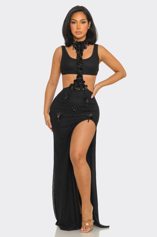 Floral Luxe Cutout Slit Maxi Dress - Black