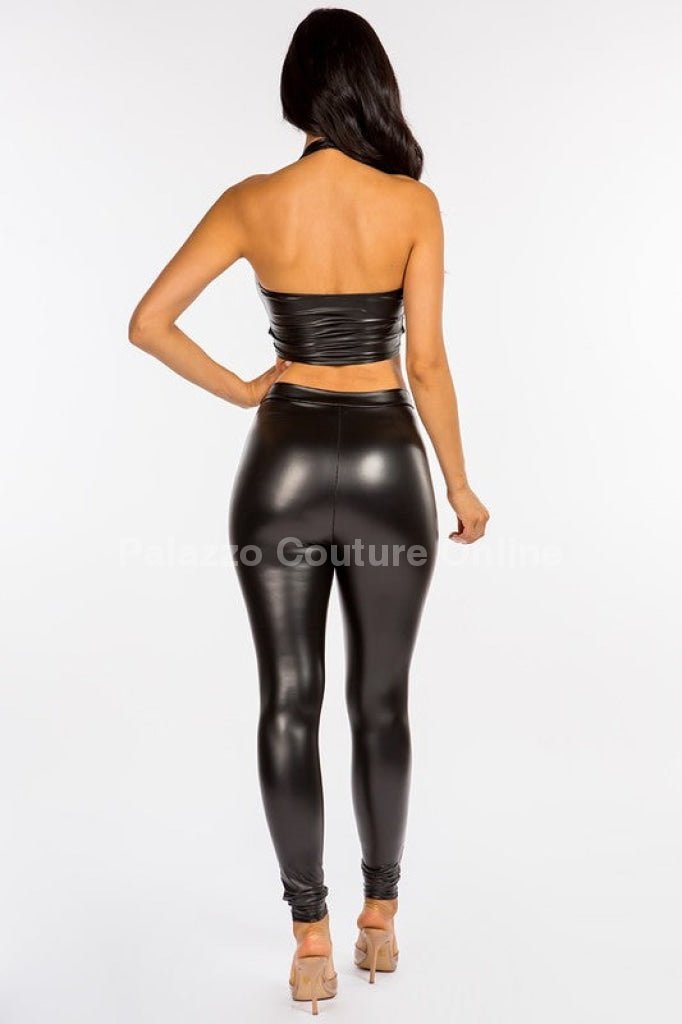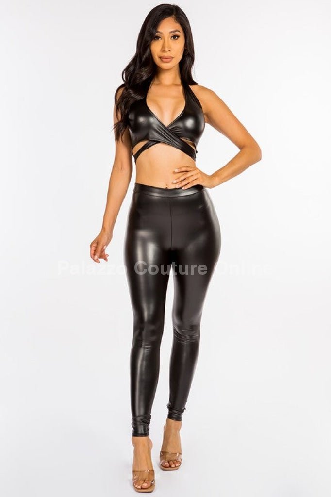 -Style: Casual, Elegant, Sexy -Pattern Type: Solid, Plain, Faux Leather, Pleather -Details: Cropped, Cut Out -Season: Spring, Summer, Fall, Winter -Top Type: Cut Out, Open Back -Bottom Type: Leggings -Neckline: V neck, Low neck -Sleeve Length: Sleeveless -Fit Type: Slim Fit -Fabric: Stretch - 92%Polyester 8%Spandex