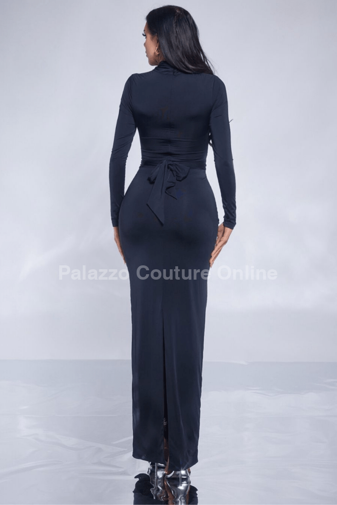 Flowing with effortless grace, the Midnight Allure Cutout Gown is designed to captivate with its bold silhouette and refined drama. This striking full-length dress features artful draping, a sultry cutout bodice, and a sleek back-tie detail that enhances its sophisticated charm. Crafted from a premium stretch fabric blend of 87% Nylon and 13% Spandex, it hugs your curves while allowing ease of movement. The adjustable tie and back zipper closure ensure a seamless fit.
