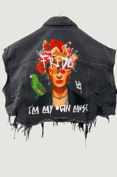 Channel the spirit of Frida Kahlo with this eye-catching crop denim vest. Featuring a vibrant back panel that celebrates the iconic artist with bold colors and florals, this piece merges art with fashion seamlessly. The raw hemline and relaxed fit give it an edgy yet comfortable feel, perfect for expressing your creative side in any setting.