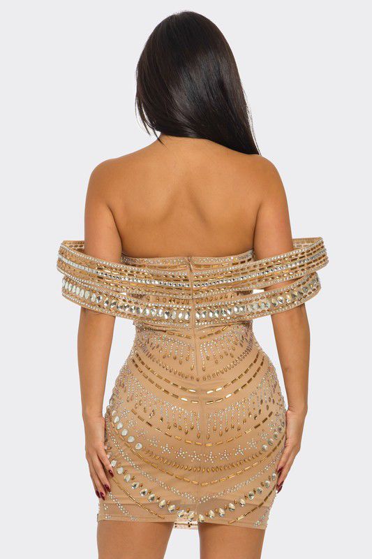 The Glam Luxe Mini Dress Nude features an off-shoulder neckline and sparkling rhinestone rings that enhance your shape. Designed to sculpt your figure with confidence, this sleek mini dress is perfect for birthdays, parties, and nights that call for standout style.