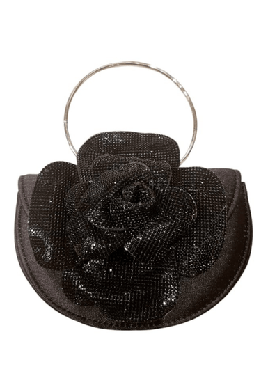 Description: This elegant satin clutch is the perfect accessory to add a touch of glamour to any special occasion. Its sophisticated design features a large crystal-encrusted flower that captures light beautifully, drawing attention with every sparkle. The circular metal handle adds a modern and functional style, making it easy to carry on the wrist. Compact yet spacious, it’s ideal for carrying your essentials in a refined way.also available in gold and silver.
