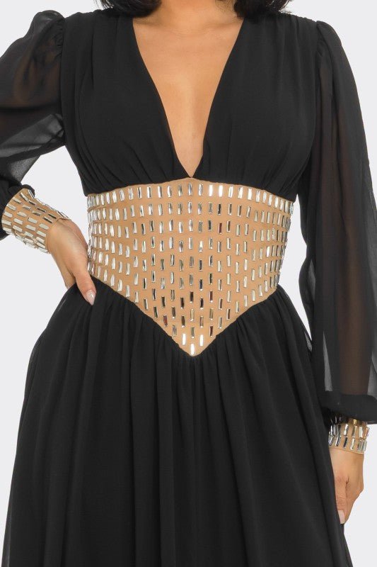 The Golden Empress Belted Maxi Dress is the perfect balance of elegance and statement style. Designed with a flattering deep V-neckline and long sheer sleeves, this flowing maxi dress creates a graceful silhouette while maintaining a sophisticated, modern look.