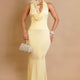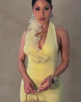 Grace the room with timeless elegance in this figure-sculpting halter maxi dress, featuring a dramatic floral ruffle detail along the neckline. Designed with a plunging front and open back, this dress exudes effortless glamour with a silky drape and curve-enhancing fit. Perfect for weddings, formal soirées, or making a memorable entrance.