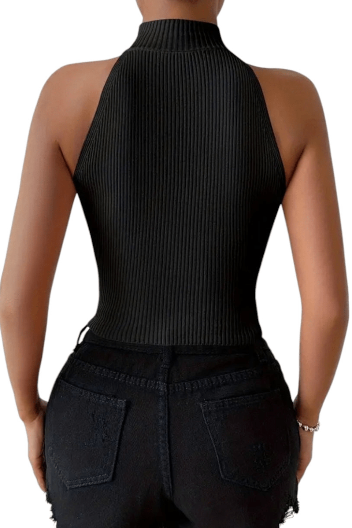 Crafted from a soft knit blend of 75% acrylic and 25% nylon, this black heart cutout sleeveless top hugs the body comfortably without losing its shape. The high turtleneck creates balance with the bold cutout, making it easy to style for layered outfits or solo wear on warmer days. Cutout Sleeveless Top