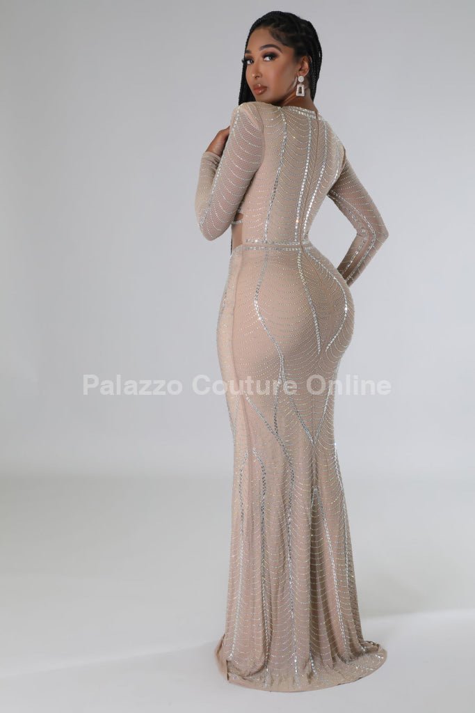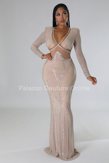 Ready to make a jaw-dropping entrance? This stunning dress is designed to offer the perfect blend of comfort and glamour. Featuring a flattering V-neck and sheer details adorned with rhinestones, it's the ideal choice for any special occasion or night out.