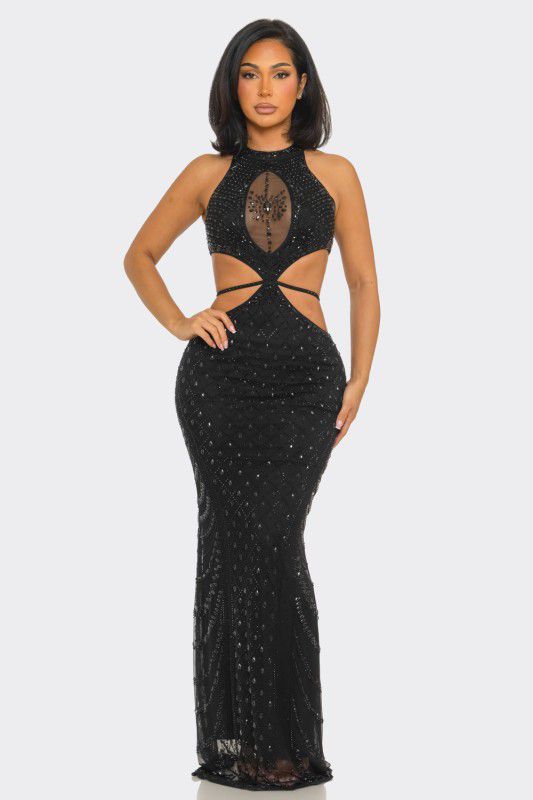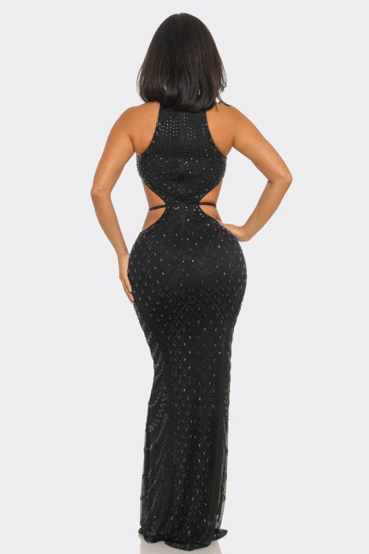 Luxe Radiance Rhinestone Cutout Maxi Dress - Black