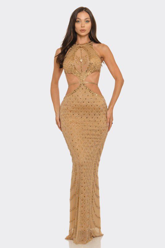 Strategically placed side cutouts with elastic detailing cinch the waist for a flattering silhouette, while the fully embellished rhinestone design delivers a radiant, red-carpet glow from every angle.