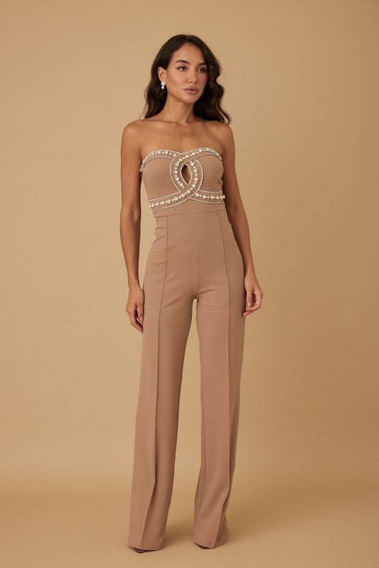 Luxe Rhinestone Strapless Jumpsuit (Mocha)