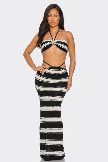 Marina Noir Striped Crochet Skirt Set – Black & Beige