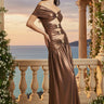 The off-shoulder draped neckline adds a romantic touch while the fluid maxi skirt moves gracefully with every step. Crafted from a soft stretch fabric with a luminous metallic finish, this dress blends elegance with modern glamour—perfect for upscale events, galas, formal dinners, and unforgettable nights out.