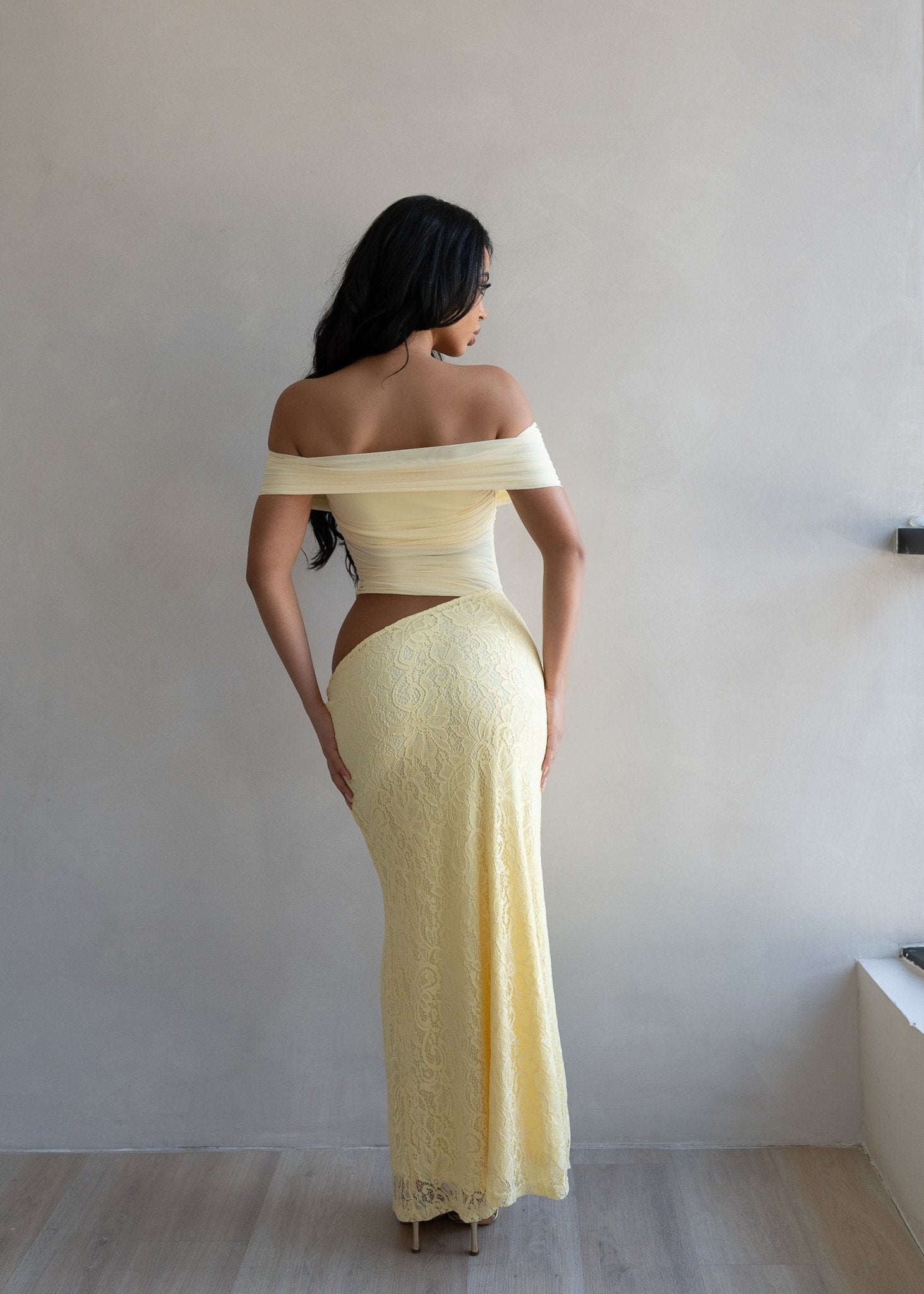 The ruched off-shoulder bodice mimics a softly draped bodysuit, while the fitted lace lower portion elongates the frame with a refined maxi finish. The subtle waist cutout enhances the shape, creating a flattering, modern contour that highlights the waistline beautifully.