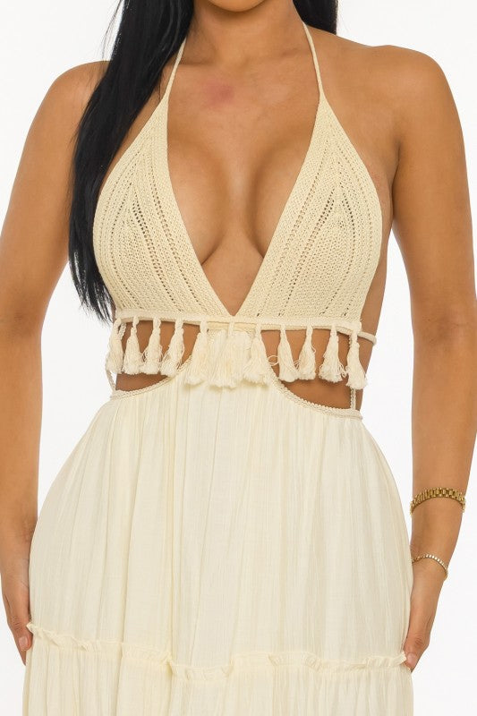 Breezy, sensual, and effortlessly elevated— Coastal Muse Tassel Maxi Dress is designed to embody modern resort glamour. Featuring a deep plunging halter neckline with delicate knit detailing, this silhouette highlights the waist with subtle cut-outs while flowing into a tiered maxi skirt adorned with soft tassel accents.