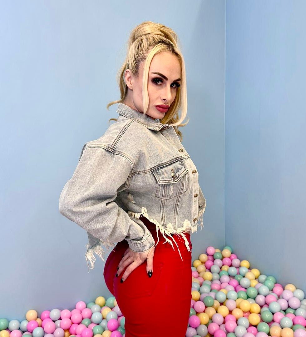 Cropped distressed denim jacket features The fun Lifestyle of Miami.