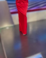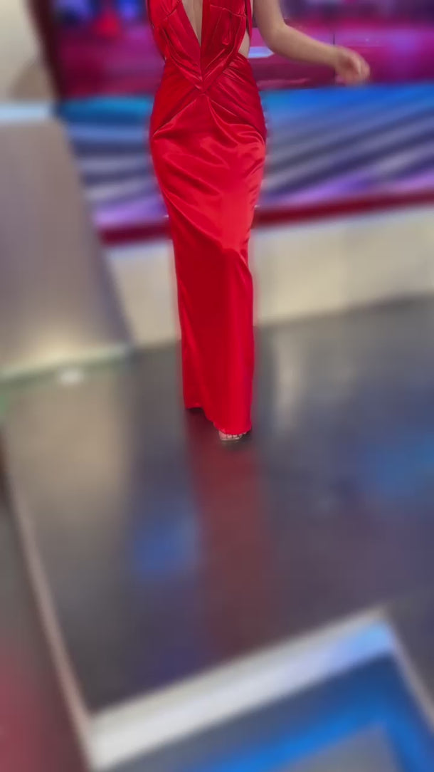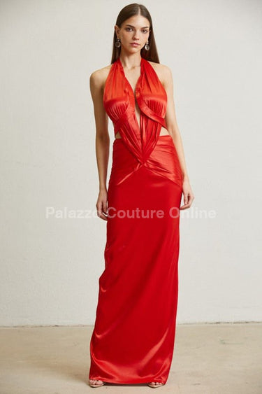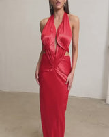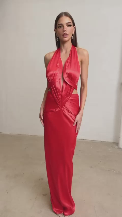 Midnight Elegance Pleated Satin Maxi Dress (Red)
