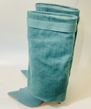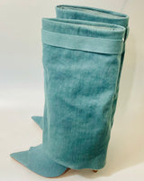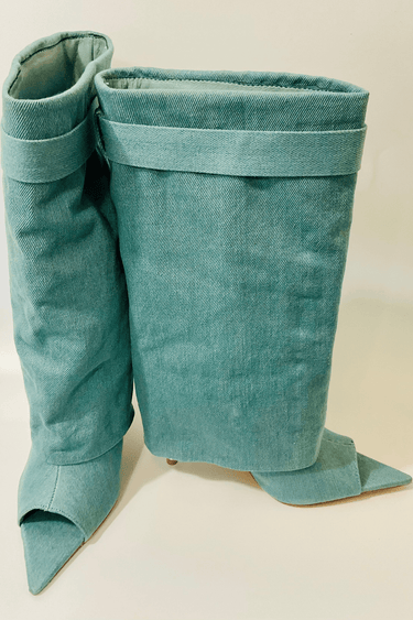 This pair is the epitome of sleek sophistication, crafted with the finest Denim material to create a seamless vision of elegance. The pointed toe and clear heel infuse a modern twist into classic contours, ensuring every entrance is unforgettable. Perfect for the woman who commands attention with her every step. Elevate your wardrobe to daring new heights with these striking boots, a true statement of chic luxury.
