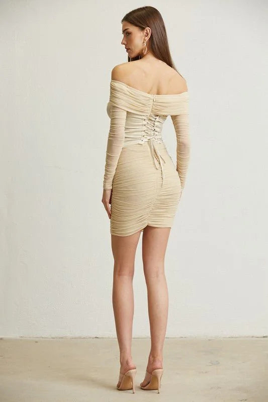 Noir Silhouette Ruched Mini Dress And Corset 2PC (Champagne) – Women's Mini Dress