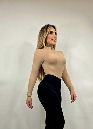 Upgrade your basics with this high-neck long sleeve bodysuit, featuring a ribbed design for a sleek and comfortable fit. The front zipper detail adds functionality and a stylish edge, making it versatile for layering or wearing solo. Crafted from a stretchy blend of 92% nylon and 8% spandex, this bodysuit hugs your curves while offering all-day comfort. Available in multiple shades to suit any wardrobe.