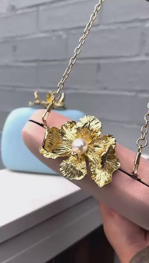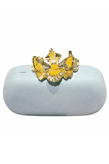 An elegant and sophisticated clutch inspired by the delicate beauty of the orchid. Its structured design, available in soft pastel shades of pink, blue, and yellow, is complemented by a gold floral clasp that adds a touch of luxury and exclusivity. Featuring a lined interior and a sleek gold chain for versatility, this clutch is the perfect accessory to elevate any evening look or special occasion outfit.