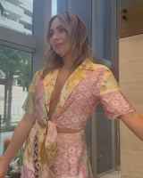 Step into confident style with the Paris Fabulous Wide Leg Pants Set. This chic two-piece set blends retro flair with modern femininity. Crafted in a vibrant pink multi print, the semi-stretch fabric moves with you, making it as comfortable as it is fashionable. The cropped top features a structured collar, short sleeves, and a flattering V-neckline that exudes effortless elegance.