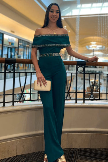 - Featuring a sleek off-shoulder neckline, this Green Jumpsuit creates a beautifully balanced look that feels both graceful and confident