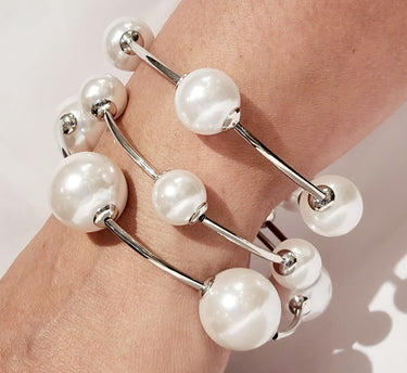 Elevate your look with the Pearl Orbital Flow Cuff in Silver — a captivating bracelet that blends modern design with timeless elegance. Featuring smooth, pearly orbs set along a sleek, sculptural silhouette, this cuff adds a graceful yet contemporary touch to any outfit.