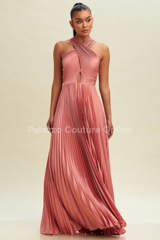 Elevate your evening attire with our stunning Pleated Cross Over Maxi Dress. This elegant dress features a sophisticated cross-over halter neckline that beautifully accentuates the shoulders and a delicate keyhole detail at the front. The back showcases an eye-catching design with a tie that adds a touch of allure. The fully pleated skirt flows gracefully with every step, offering a timeless and chic silhouette. Perfect for formal events, weddings, or any special occasion, this maxi dress combines modern style with classic elegance. Pair it with statement earrings and your favorite heels to complete an unforgettable look.