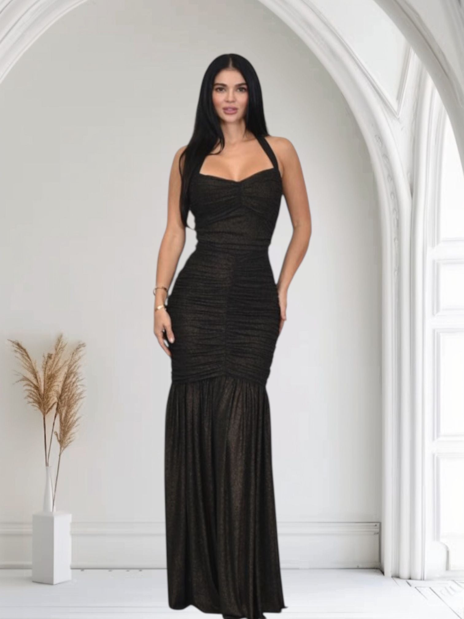 Radiant Nights Metallic Foil Ruched Maxi Dress - Black