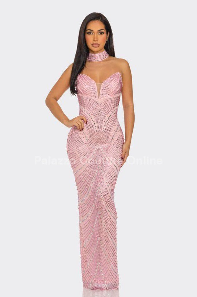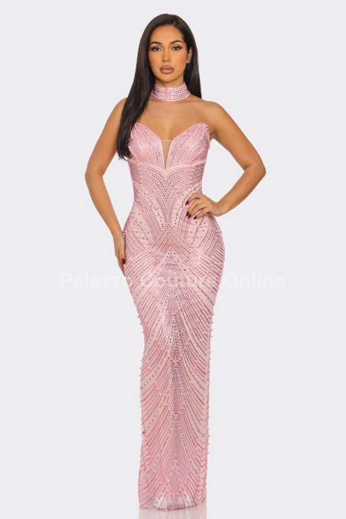 Dazzle in the Radiant Pearl Mesh Gown Maxi Dress, a breathtaking design featuring intricate pearl embellishments, a deep V-neckline, and a seductive backless silhouette. The halter neck ribbon adds an elegant touch, while the see-through mesh detailing enhances its allure. Crafted from 95% polyester and 5% spandex with a 93% polyester and 7% spandex lining, this strapless gown offers both comfort and a figure-hugging fit perfect for making a bold statement at any event.