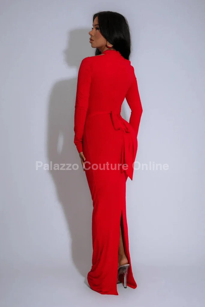 Flowing with effortless grace, the Scarlet Elegance Cutout Gown is designed to captivate with its bold silhouette and refined drama. This striking full-length dress features artful draping, a sultry cutout bodice, and a sleek back-tie detail that enhances its sophisticated charm. Crafted from a premium stretch fabric blend of 87% Nylon and 13% Spandex, it hugs your curves while allowing ease of movement. The adjustable tie and back zipper closure ensure a seamless fit.