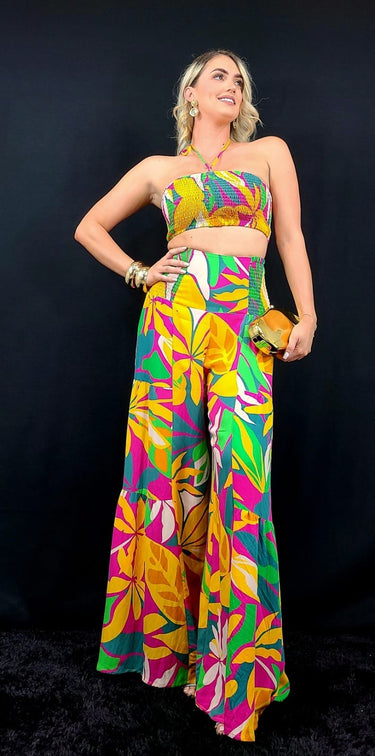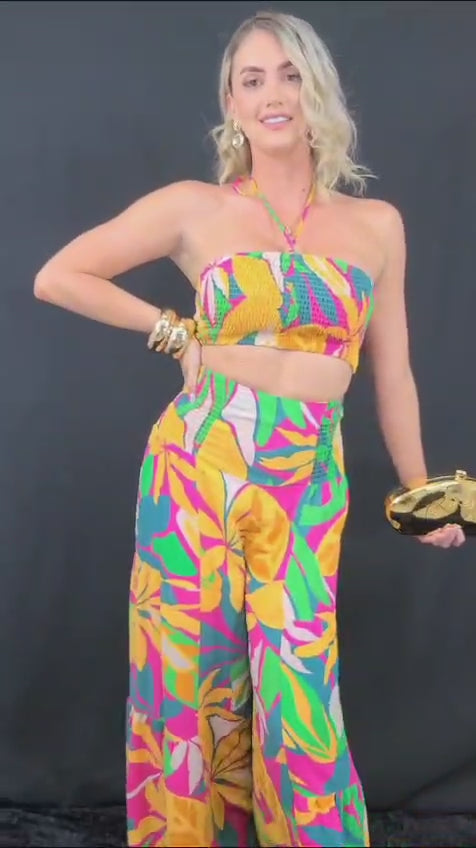 Embrace the spirit of summer with our Tropical Bliss Printed Linen Two-Piece Pant Set! This stunning ensemble features a daringly bold print, bursting with lush tropical leaves and vivid floral motifs, perfect for making a statement. The set includes a flattering, twist-front crop top and flowing wide-leg pants that promise both comfort and style. Crafted from a lightweight fabric, it's ideal for balmy days or sizzling nights out. Whether you're vacationing or just adding a splash of color to your day, this set ensures you'll stand out in the best way possible. Elevate your wardrobe with this must-have, exquisitely designed for the fashion-forward!Contents & care