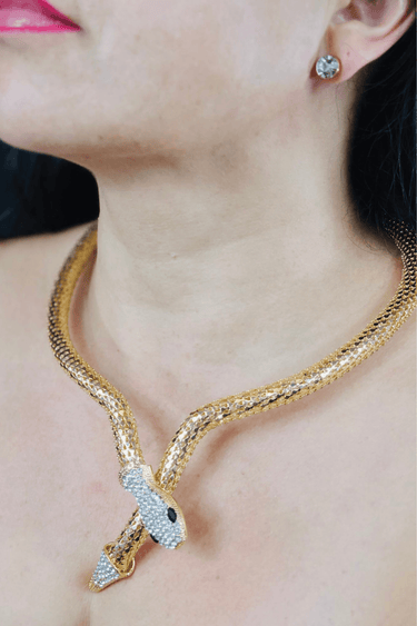 Unleash your bold side with the Serpentine Allure Necklace Set. This striking ensemble features a meticulously designed serpent motif necklace, encrusted with shimmering stones that catch the light from every angle. Complementing the necklace, the set includes matching earrings to complete your look. The intricate details and unique design make this set a standout addition to any jewelry collection, perfect for making a statement at any event. Embrace the allure of the serpent and add a touch of daring sophistication to your ensemble.
