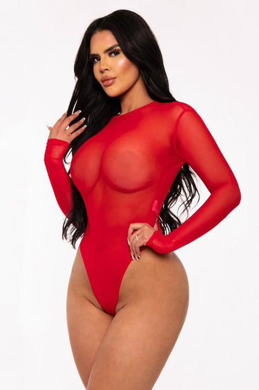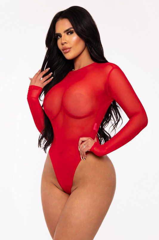 Unleash your boldest side with the Scarlet Desire Bodysuit, designed to captivate and seduce. This long-sleeve bodysuit features a sheer mesh fabric that hugs your curves with elegance and sensuality. The high-cut thong bottom and form-fitting design make it perfect for creating striking and sophisticated looks. Pair it with high-waisted jeans, skirts, or let it stand out on its own for a special night. Make a daring statement with this irresistible piece!