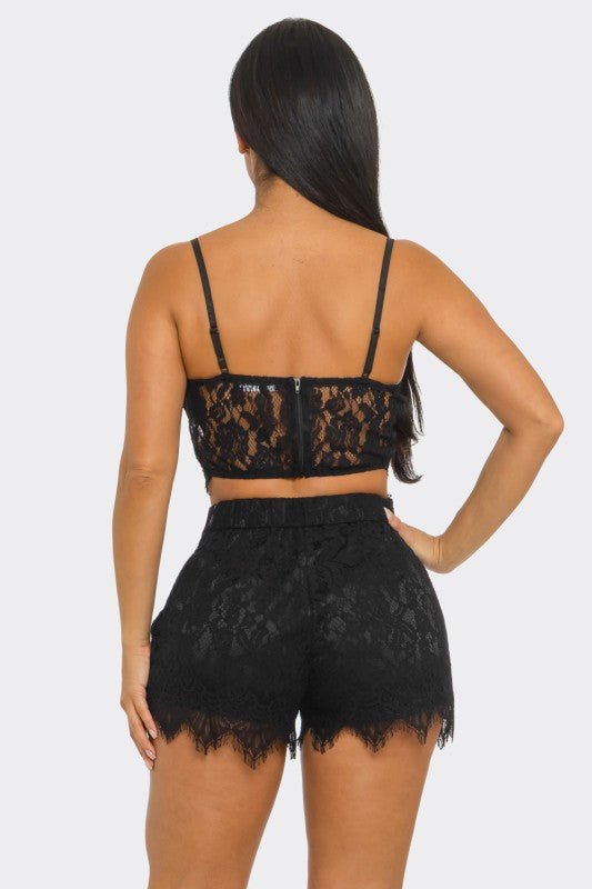 Make an unforgettable entrance in this ultra-chic three-piece lace ensemble designed to sculpt, elevate, and empower. The Midnight Lace Three-Pieces Blazer and Shorts Set features a structured floral lace blazer, a delicate lace bustier top with adjustable straps, and high-waisted lace shorts finished with scalloped eyelash trim.