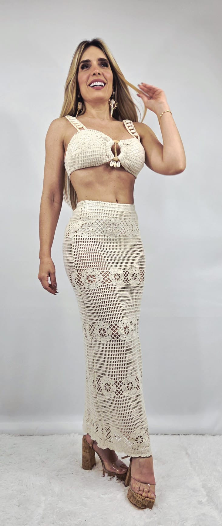 Embrace effortless elegance with the Seaside Charm Crochet Skirt Set, a beautifully crafted two-piece ensemble perfect for sun-soaked getaways and coastal escapes. Featuring a delicate crochet-knit top adorned with braided straps and shell accents, this set exudes bohemian sophistication. The matching maxi skirt offers a soft, flowy silhouette with intricate floral detailing, enhancing its breezy appeal. Designed with stretch for comfort, it includes a back zipper and a matching undergarment for coverage. Pair it with your favorite sandals to complete a chic, relaxed look.