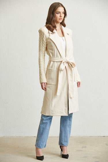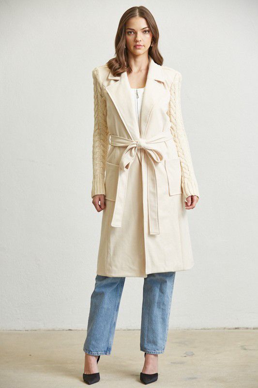 Stay cozy and chic with this timeless trench coat featuring a wool-like fabric bodice and elegant cable knit contrast sleeves. The open-front design with a notched lapel collar exudes sophistication, while the ribbon tie waist enhances your silhouette. Practical patch pockets add functionality to this versatile piece. Perfect for layering, this coat is crafted from 100% polyester, combining style and warmth for the cooler seasons.